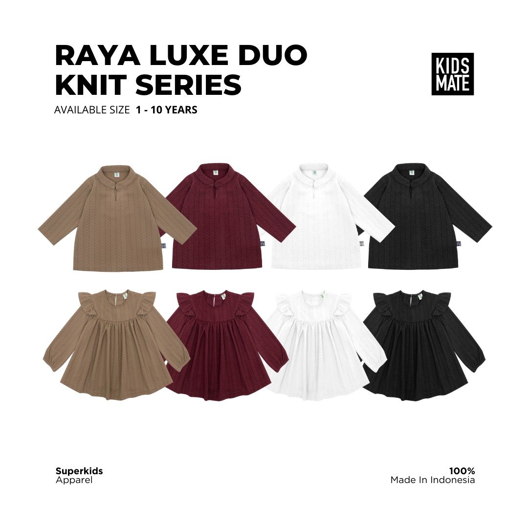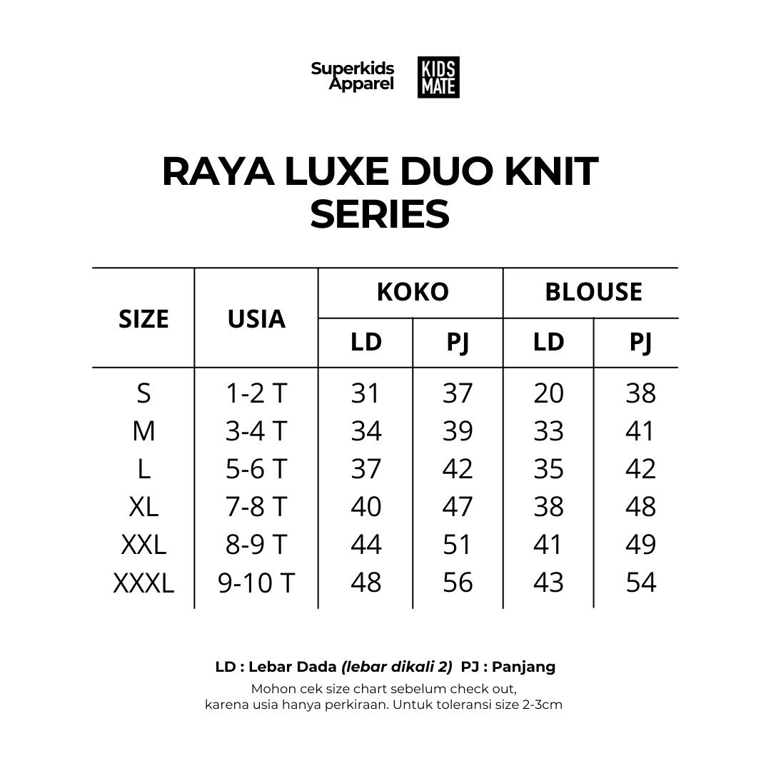 Koleksi set koko dan blouse anak dengan desain serasi yang elegan untuk momen Raya. Menggunakan bahan knit bertekstur yang lembut dan nyaman, memberi tampilan rapi tanpa terasa kaku saat dipakai.